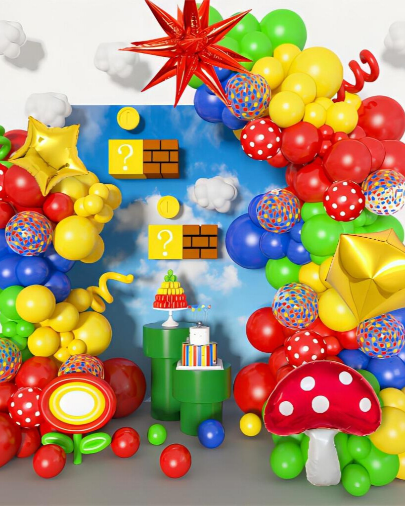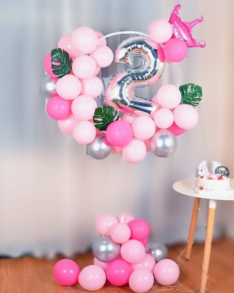 • Halber, dichter Ballonbogen auf einer Seite oder geteilter, dichter Ballonbogen links und rechts mit insgesamt ca. 150 Ballons nach Wunschfarbe oder Motto